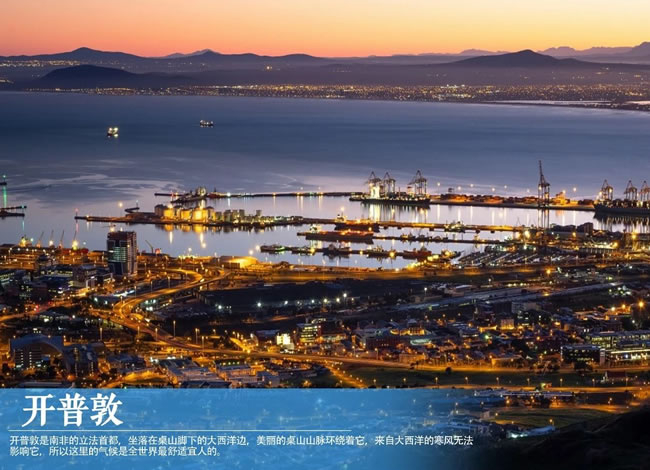 【開普敦】是歐裔白人在南非建立的第一座城市,這座南非白人心中的母城三百余年來數(shù)度易主,歷經(jīng)荷、英、德、法等歐洲諸國的統(tǒng)治及殖民,雖然地處非洲,但卻充滿多元歐洲殖民地文化色彩。開普敦集歐洲和非洲人文、自然景觀特色于一身,因此名列世界最美麗的都市之一,也是南非最受歡迎的觀光都市。
