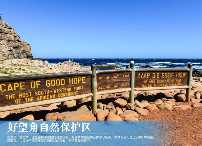 【好望角】于開普半島南端,在保護(hù)區(qū)內(nèi),鐵銹色凹凸不平的地面上生長著一片片低矮的灌木叢和被稱為南非國花的山龍眼,狒狒、非洲旋角大羚羊等動物間或在眼前一躍而過。在大西洋邊紅色的卵石灘上,時??梢婑匄B閑庭信步的可愛模樣。在保護(hù)區(qū)的西南端有一個如同伸入大西洋中巨大鱷魚爪的岬角。