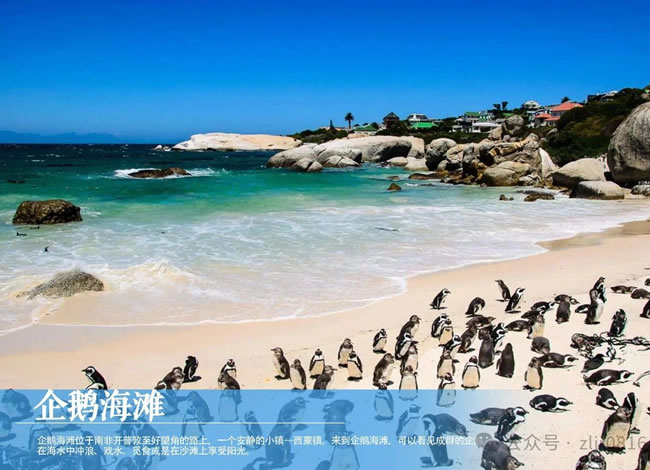 【企鵝海灘】走在木板搭建的長廊上,深入到企鵝們棲息的海灘,近距離地觀賞企鵝。成群的企鵝在海灘邊上的海水中沖浪、戲水、覓食或是在沙灘上享受陽光。