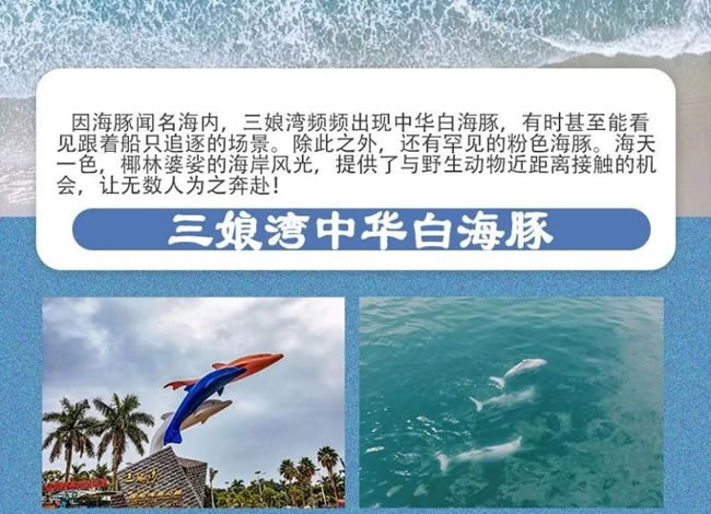 因海豚聞名海內(nèi),三娘灣頻頻出現(xiàn)中華白海豚,有時(shí)甚至能看見(jiàn)跟著船只追逐的 場(chǎng)景。除此之外,還有罕見(jiàn)的粉色海豚。海天椰林婆娑的海岸風(fēng)光,提供了與野 生動(dòng)物近距離接觸的機(jī) ·備讓無(wú)數(shù)人為之奔赴!